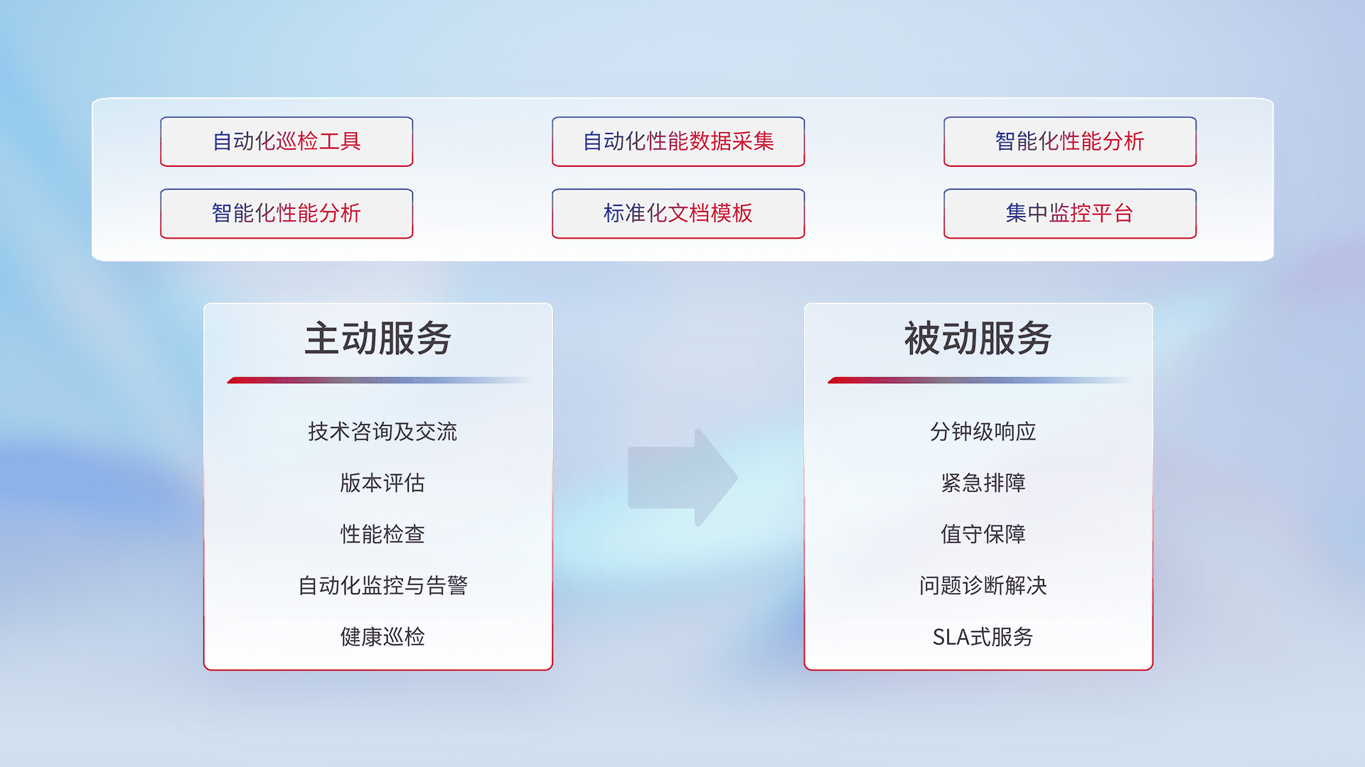 智能化工具和标准化文档,,保障服务质量,,,,提供主动服务(包含技术咨询、、版本评估、、、、性能检查、、自动化监控与告警、、健康巡检)和被动服务包含(分钟级响应、、、紧急排障、、、值守保障、、、问题诊断解决、、SLA服务)。。。。