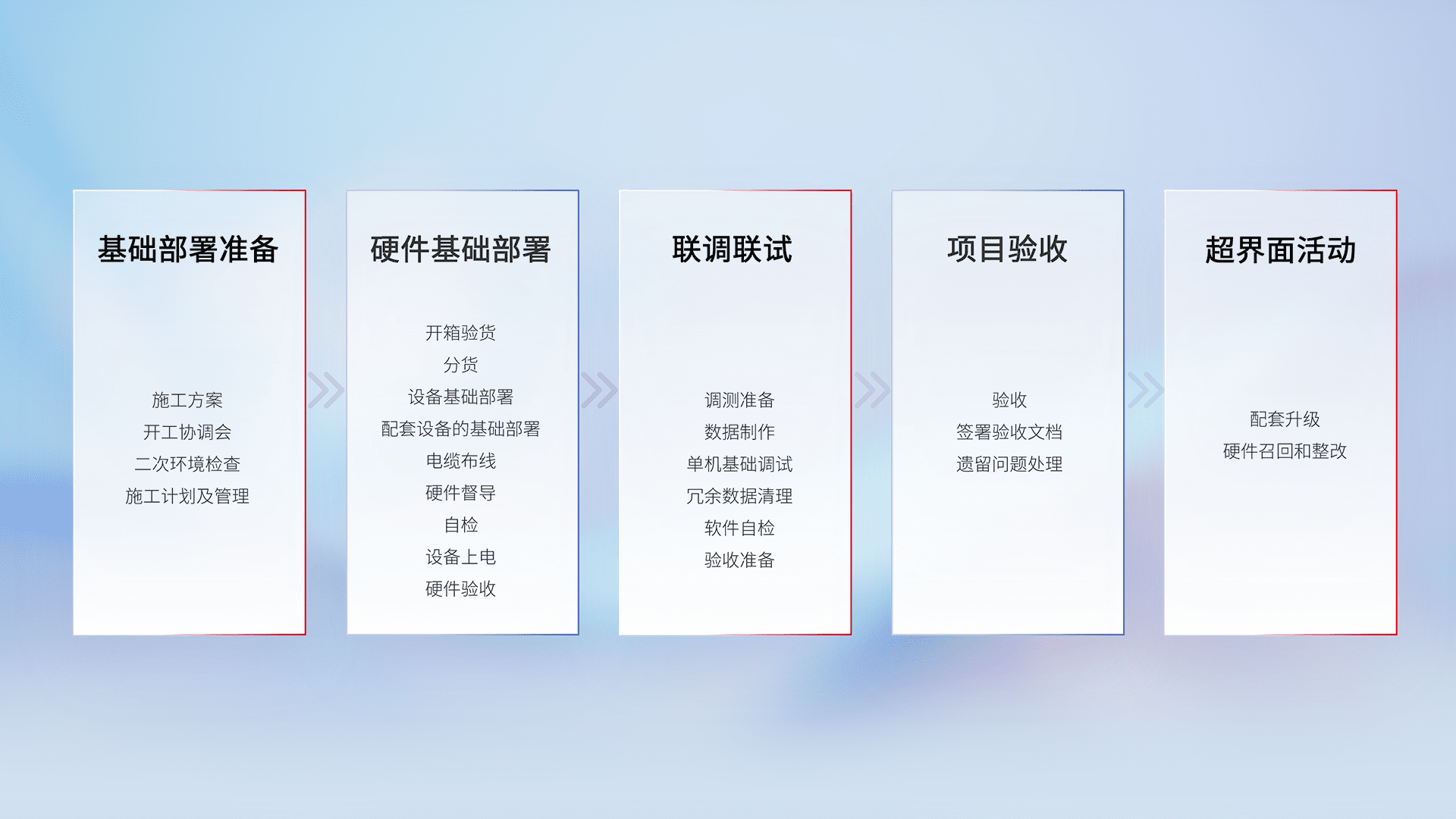 从基础部署准备、、、硬件基础部署、、、联调联试、、、项目验收、、、、越界面活动的全过程可追溯,,保证施工质量和进度。。。